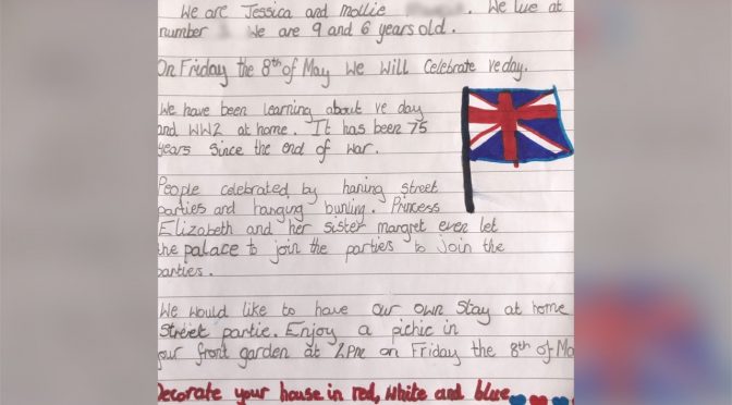 Jessica and Mollie have been hard at work learning about WW2. To help celebrate the girls decided to organise a ‘Stay At Home Street Party’ to celebrate the 75th anniversary of the end of the war. They wrote a letter and posted to their neighbours to encourage them to remember our heroes. they even had a reply from one of their neighbours. We think this is a wonderful idea girls and would love for you to let us know how your party goes. Well done.
