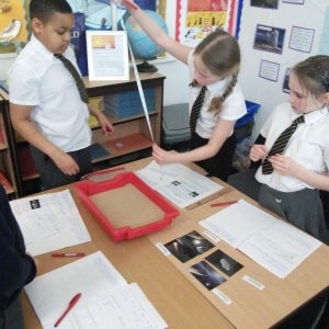 As part of their science Year 5 investigated how craters may be created on the moon and what effect their height may have on them. They used flour and cocoa as the moon’s surface and balls as the meteors before dropping them from various heights and investigating their results.