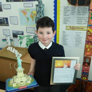 Every half-term, Year 5 are given a series of Topic tasks to choose from to complete as part of their homework. Take a look at some of their fantastic models of totem poles, the Empire State Building, the Golden Gate Bridge, the famous Hollywood sign and the Statue of Liberty. The children also researched many other aspects of North America and wrote non-chronological reports, designed holiday brochures and wrote diary entries based on potential travel.