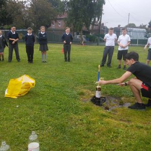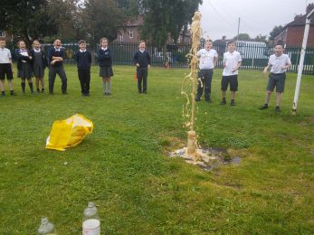 Year 5 have had great fun during science week, finding out about nucleation. This involved creating diet coke and mentos geysers. These geysers are caused by a process called nucleation, where the carbon dioxide in the soda is attracted to the small bumps on the surface of the Mentos. That creates so much pressure that the soda goes flying up into the air quite spectacularly. Mr Clarke volunteered to release the mentos into the bottle whilst Mrs Moran stood at a safe distance taking the photos.