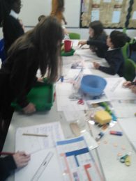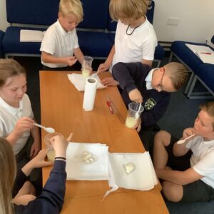In Science this half term, we have been studying changes – both reversible and irreversible. We have been doing several investigations to show this. We have looked how mixing baking soda and vinegar and create carbon dioxide and we proved this by showing how it can inflate a balloon when we mix them. We also looked at creating a new material when we mixed warm milk and white vinegar.