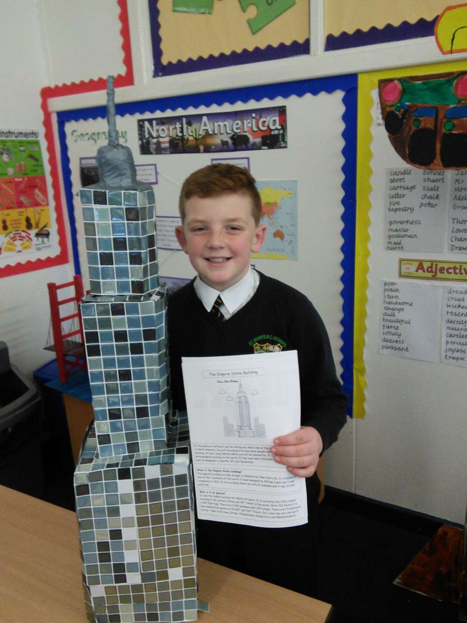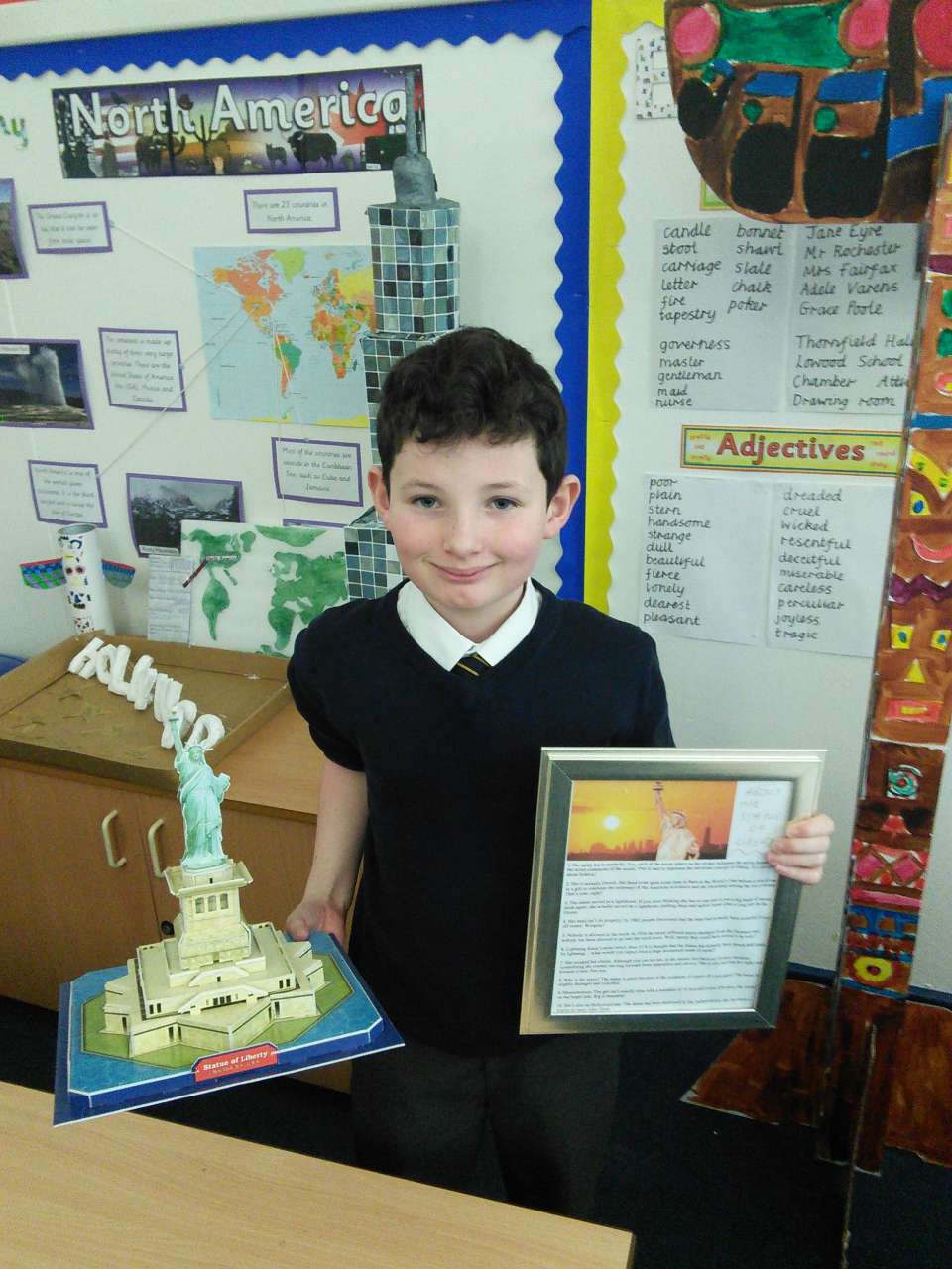Every half-term, Year 5 are given a series of Topic tasks to choose from to complete as part of their homework. Take a look at some of their fantastic models of totem poles, the Empire State Building, the Golden Gate Bridge, the famous Hollywood sign and the Statue of Liberty. The children also researched many other aspects of North America and wrote non-chronological reports, designed holiday brochures and wrote diary entries based on potential travel.
