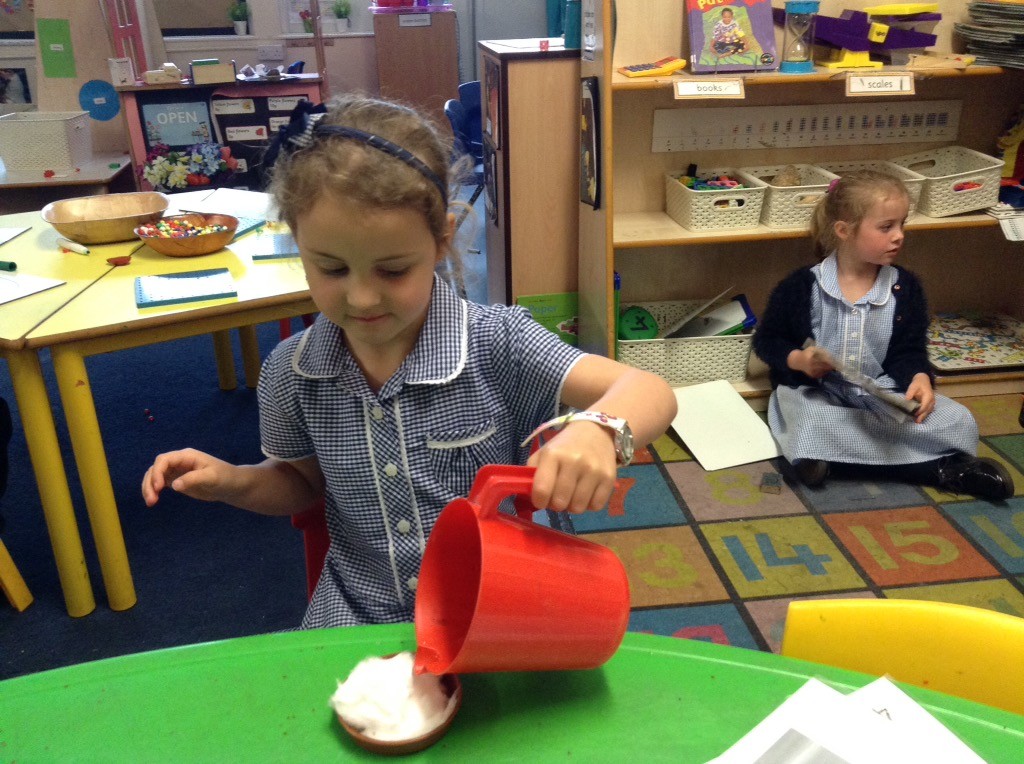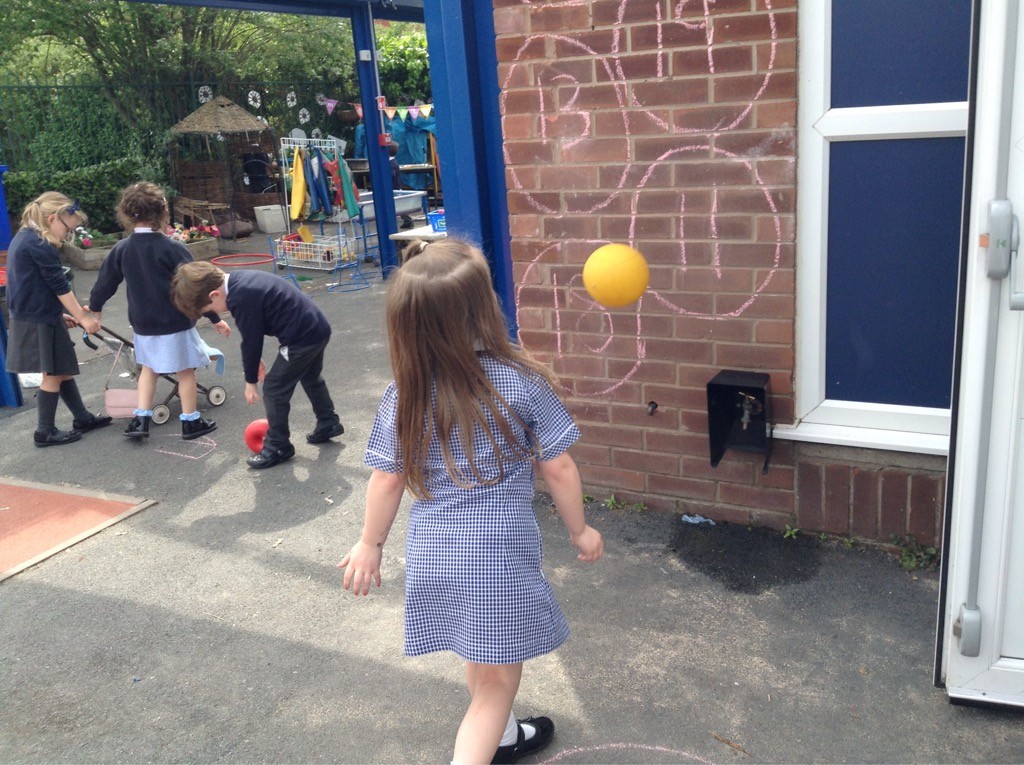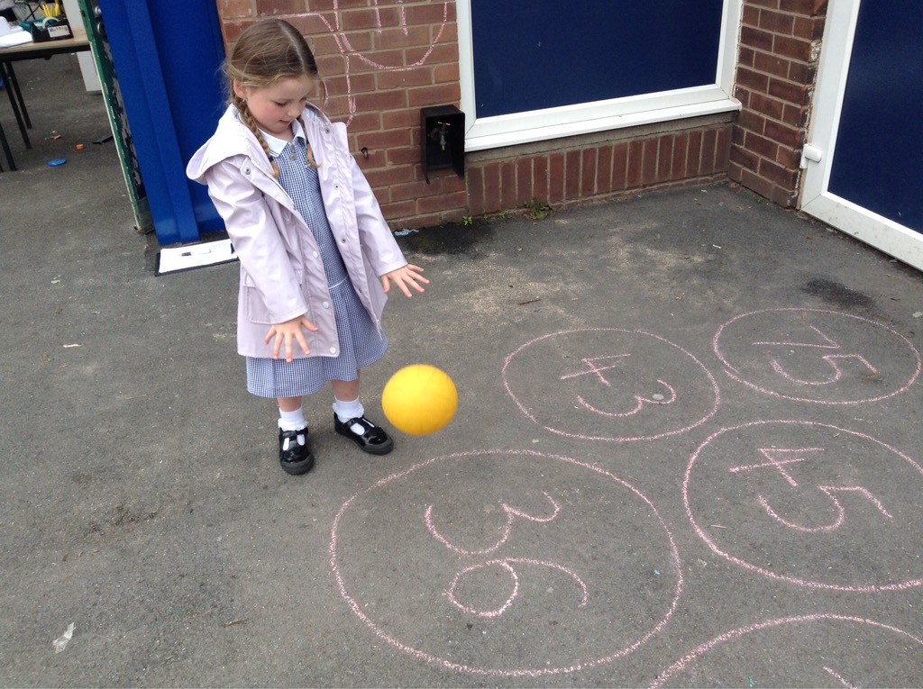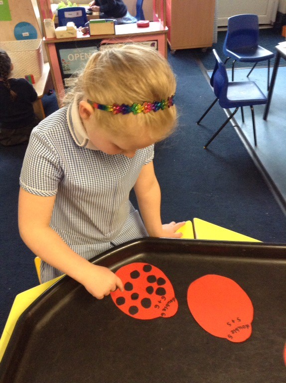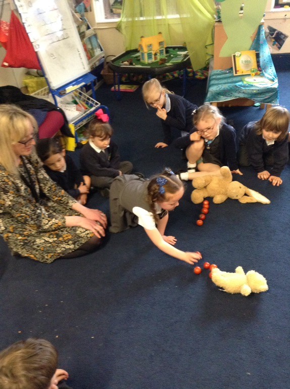In maths we have been adding and subtracting in different ways: using objects, numicon shapes, fingers and counting on and back. We have been doubling by making ladybird doubles with the same amount of spots on each side. We have also been halving groups of magic beans between our teddy bears. We are continuing to practise counting backwards from 20 and have enjoyed some fun aiming games outside finding the number 1 fewer than a number.