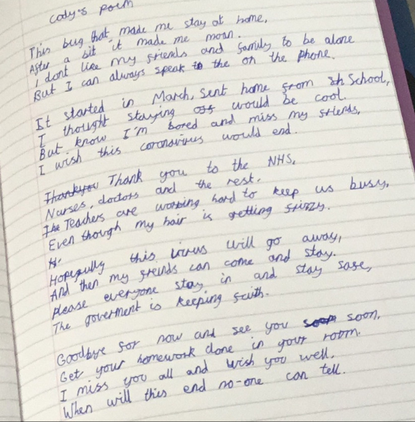 More fantastic work from Year 5 submitted to Class Dojo. Cody has written a wonderful poem about his time in lockdown, how much he misses everyone and his frizzy hair! Amelie has designed an excellent poster encouraging everyone to stay happy and demonstrating social distancing with monsters! Finally, Ella has been hard at work completing extra comprehensions and maths work. Well done and keep it up.