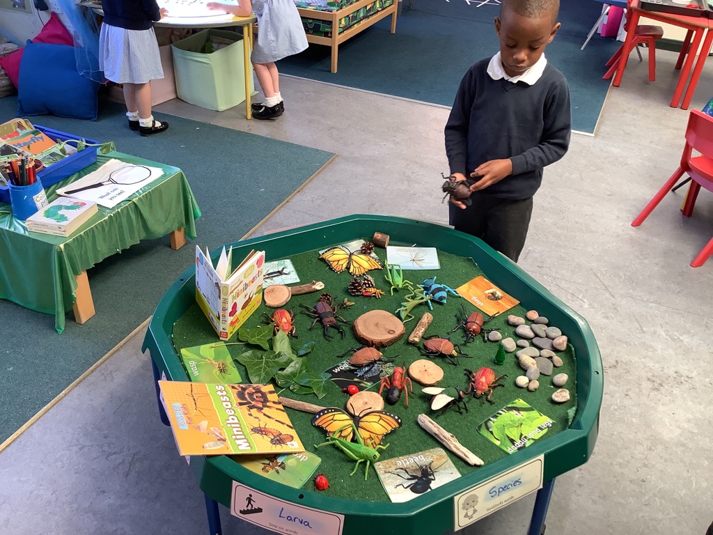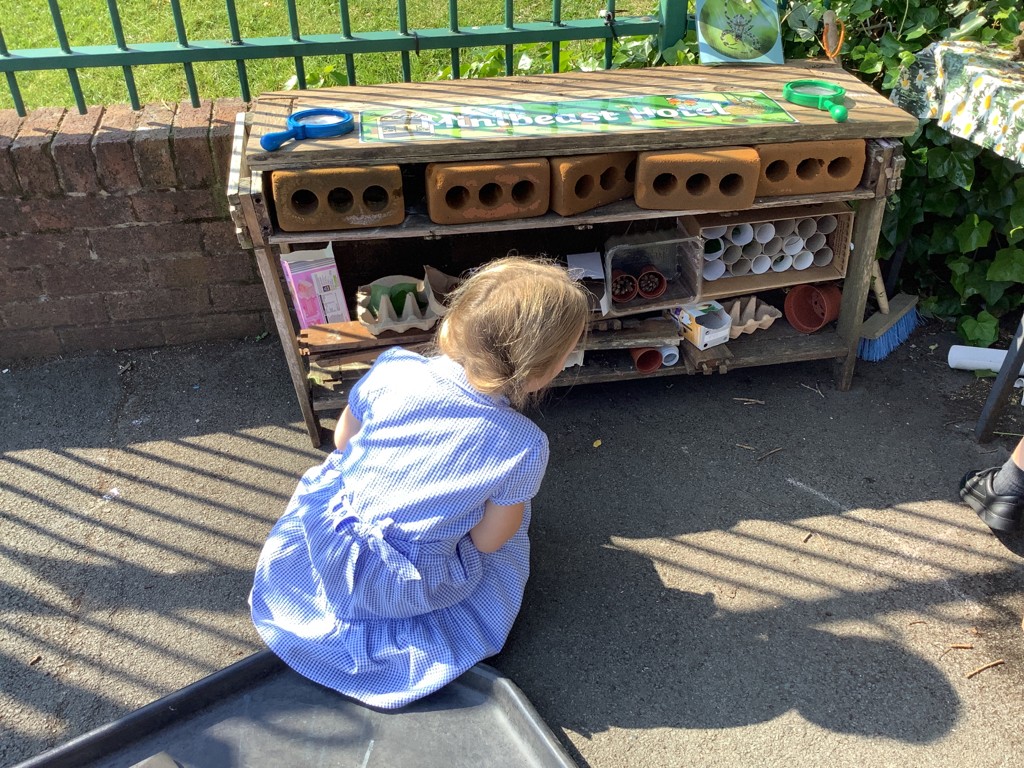 This week in F1 we have been very busy learning all about Minibeast Habitats. We have started to create a minibeast hotel in our outdoor area using pots, boxes and natural materials. We have also made our very own homes for minibeasts and chose which creature it might be best suited for. We looked for bugs outside using the binoculars and were lucky enough to find a snail, ladybird and beetle who are now our first hotel customers! We used checklists to help us find the minibeasts and also had lots of fun exploring the different creatures hidden in our slime tray outdoors this week! We have also been working hard to learn some new vocabulary linked to our topic and try and remember to use our new words in conversations in class! What a super science learning week we have had!