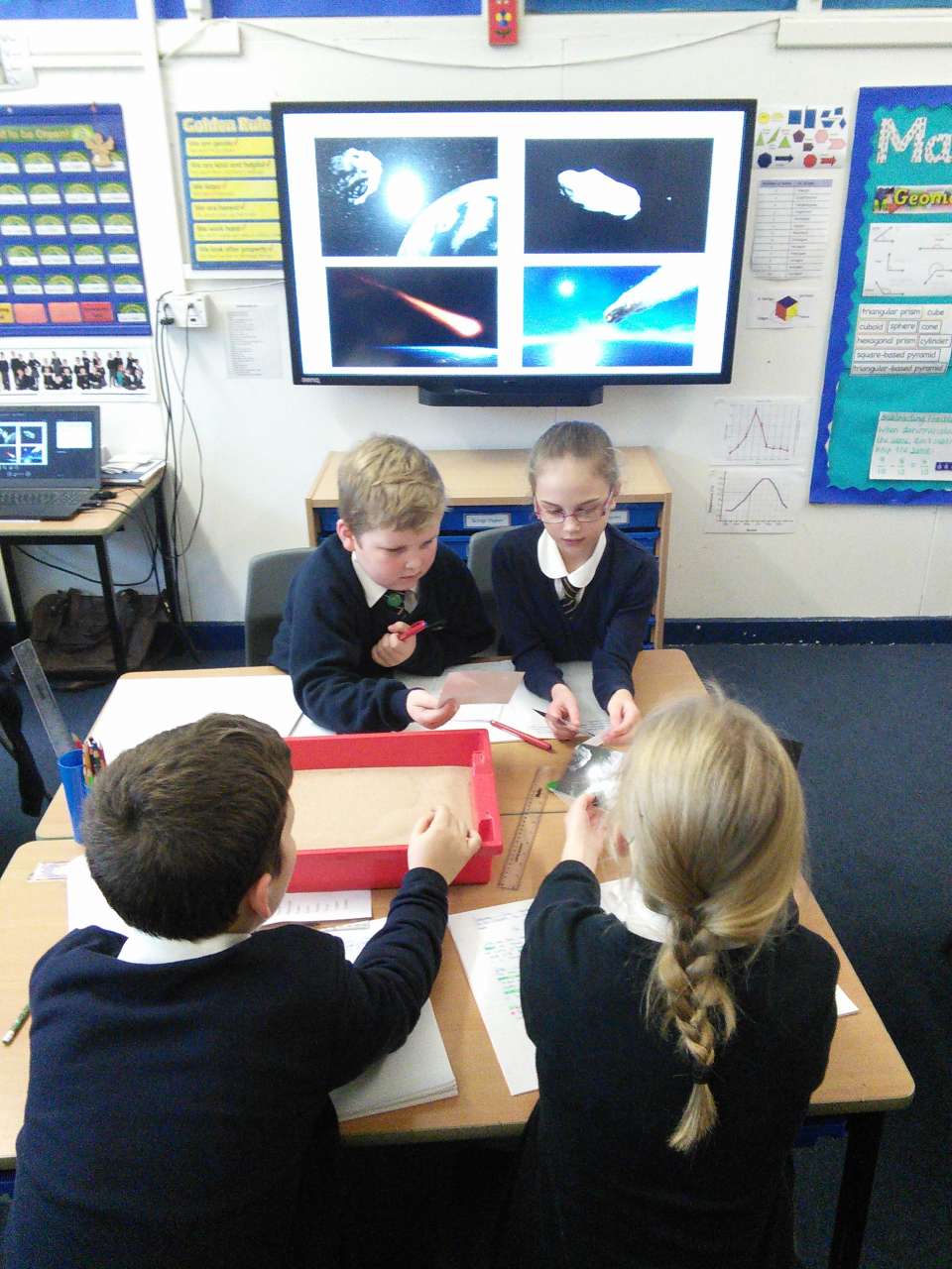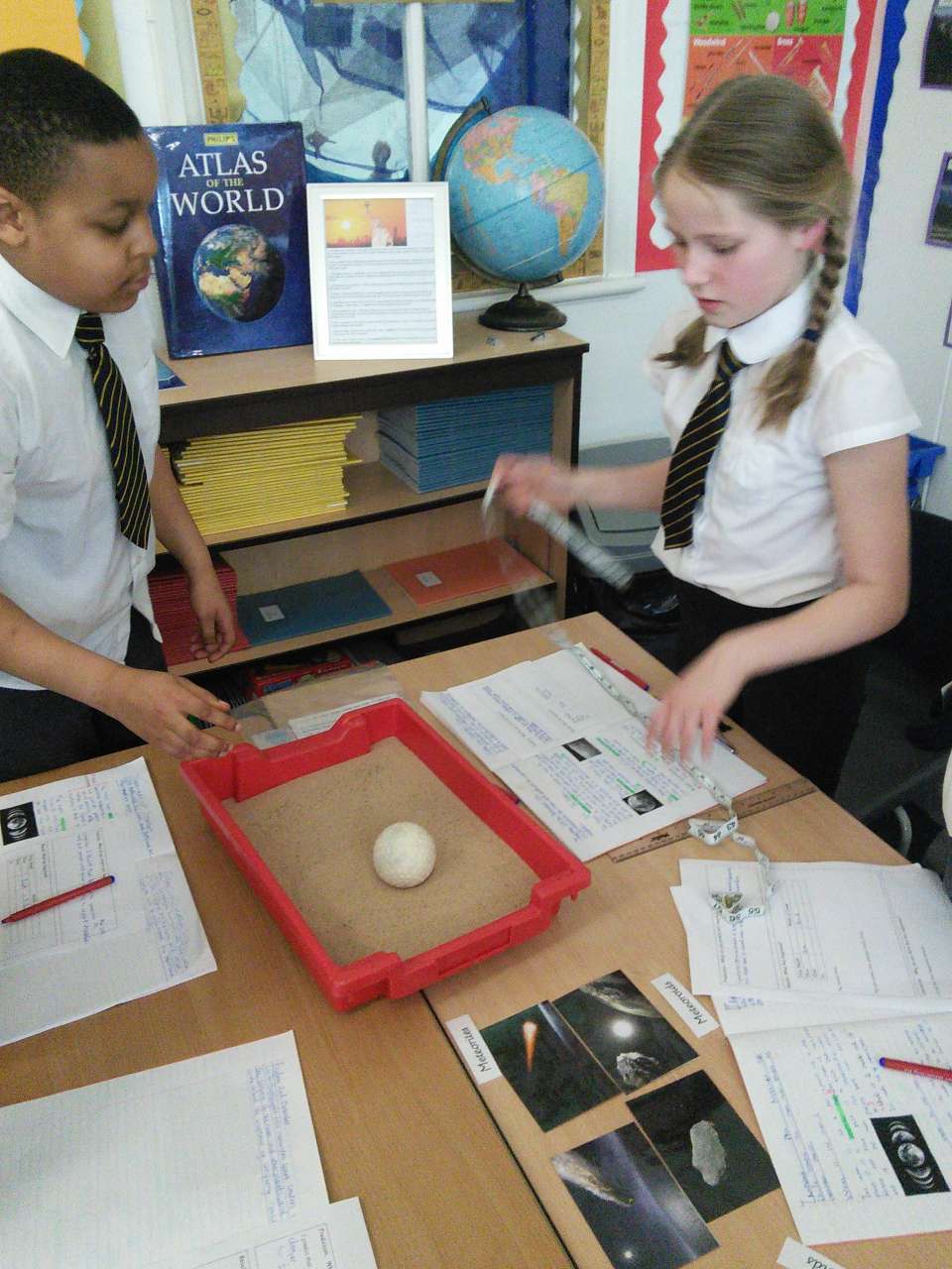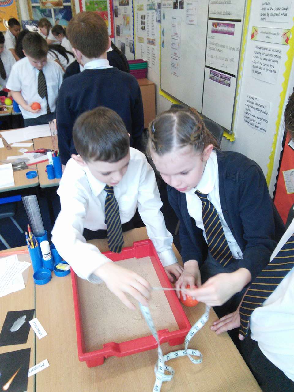 Year 5 have been learning about Space and have been finding out about the moon’s surface. This week, they planned an investigation to find how craters are formed and whether the distance a meteorite is away its surface, impacted on the size of the crater made. After ensuring it was a fair test and they had a clear method, each group worked accurately to measure and their record what they found out. Each group then imputed their results into a spreadsheet so we could work the class averages and draw a conclusion. As most children predicted, their results showed that the further a meteorite is away from the moon’s surface, the bigger the crater it will make. The experiment really showed the children the importance of comparing results and repeating an experiment more than once- just like real scientists do!